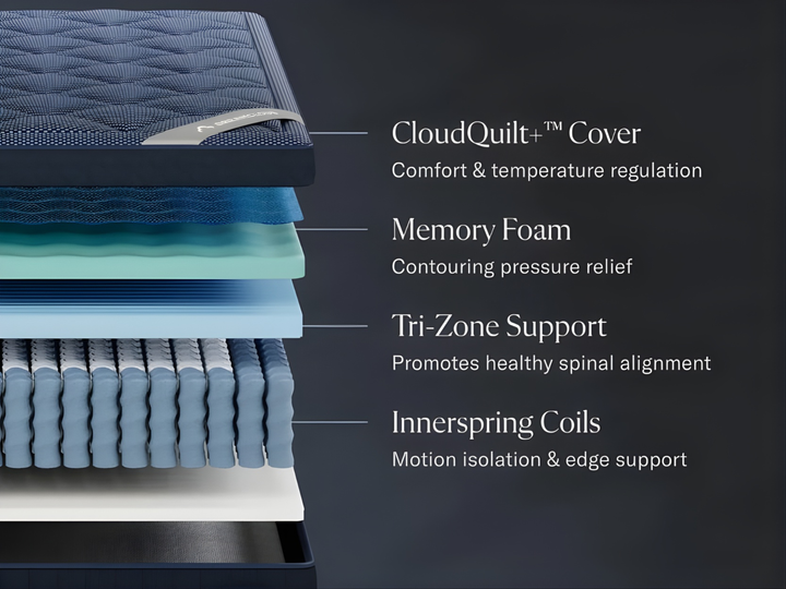 DreamCloud Luxe Hybrid features a 7-layer design with memory foam and cooling fibers quilted into our signature CloudQuilt+™ euro top. Individually wrapped coils provide responsive, breathable support, while extra-cooling phase change material and our innovative tri-zone support system target your back and hips for next-level comfort.